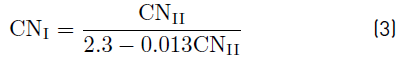 The antecedent moisture conditions (AMC) represent the hydrological response of a basin to precipitation when it has accumulated water from events that occurred five days before. The accumulated values that are between 0 and 36 mm are considered dry conditions, for the values between 36 and 53 mm average conditions and for accumulated events greater than 53 mm, they are considered wet. Equation (1) reflects a CN for an average condition (CNII), for dry and wet conditions Equations (3) and (4) are presented, respectively [13, 31]: