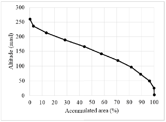 The Hypsometric property is a convenient and objective way to describe the relationship between the altimetric characteristics and the surface of the basin. The hypsometric curve of the Arroyo Grande basin is presented in Figure 2, a normal mass distribution with respect to height is observed. The shape of the curve in S corresponds to a typical shape of a basin in equilibrium or mature stage. This condition is typical of basins developed on relatively homogeneous rocks. It can be said that the processes of erosion, runoff and the contributing slopes are stable; that is, a system of slopes, channels and slopes has been developed more efficiently by reducing the reduction of land mass by the available drag forces, which allows it to balance against the resistive cohesion forces maintained by the bedrock, soil and vegetable layer [7].