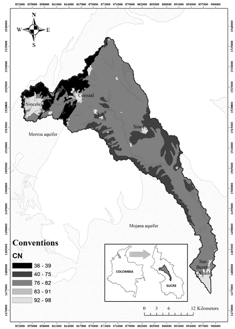 With the CN values, S was estimated for the study basin, the results are presented in Table 6. The variation of S is inversely proportional to CN. The North zone shows the best infiltration potential of the basin with ranges between 119.53 and 451.55 mm, corresponding to 10% of the total area (7,060 Ha), indicating a high potential for underground flow, over this area the Morroa aquifer is intercepted, where the areas that favor recharge are identified. HSG type A, generated the greatest influence on the results, although the conditions of vegetal cover are unfavorable. It is inferred that, by improving the coverage variables of the terrain with vegetation of the shrub zone (forest), the infiltration conditions are considerably improved and with this the recharges of the aquifers. It is important that the areas identified with high infiltration potential present land uses that do not affect the hydrological conditions and do not generate risks in the quality of both surface and subsurface water, therefore, plans for protection and social management for the care must be made.