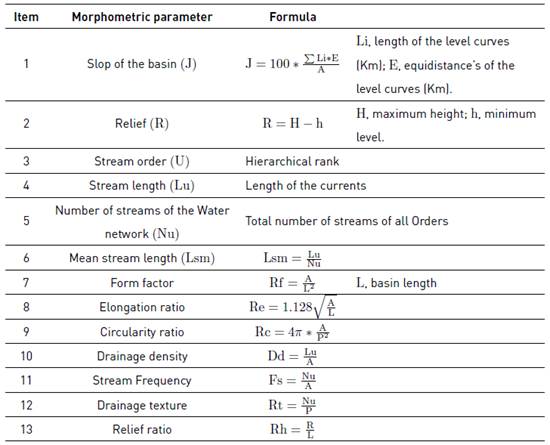 The determination of the morphometric indicators was carried out through systematic analysis with ArcGIS software, several thematic layers with necessary information were created. The process was carried out in the following manner: a) the study basin was delineated, for which cartography of the streams was used in Shapefile format (scale 1: 100,000 available at: http://www.siac.gov.co /) and digital elevation models DEM (available at: http://srtm.csi.cgiar.org/); b) DEM data from the delimited watershed was imported into ArcGIS 10.3 with which parameters were defined: slope, orientation and relief maps; c) with the drainage layer, the ordering of the flows was carried out according to the Strahler technique [26]; d) The characteristics of the basin as area, perimeter, length of the basin and length of the currents were obtained with the GIS tools. Morphometric parameters such as the mean slope of the basin, average length of the water network, Form factor, Elongation ratio, Circularity ratio, Drainage density, Stream frequency, Drainage texture and relief ratio were evaluated with mathematical formulas presented in Table 1 [9, 26, 28-30].