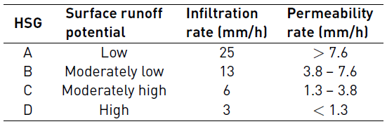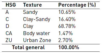 The method classifies the soil hydrological groups (HSG) into A, B, C and D, according to their infiltration rate. A refers to soils with coarse grains, sand type and sediments with a high infiltration rate, up to D, which correspond to expansive soils when they are humid. Table 2 presents a summary of the characteristics of the HSG [13, 31].