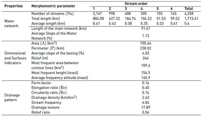 The morphology of the basins is evaluated through morphometric indicators that allow understanding the dynamics of the surface water flow, because it studies and analyzes the forms, the processes of evolution and modeling of the surface of the land. Its application is given by the calculation and analysis of quantitative indicators that have been developed through numerous studies and describe the characteristics of the surface, the relief, the composition of the water network and the flow patterns [7-10]. It is an indispensable step when carrying out hydrological studies.