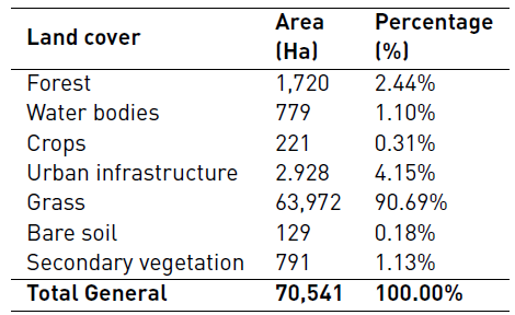 The information of the land cover in the Arroyo Grande basin was adjusted according to the CN method [34], in seven subclasses representative of the study area shown in Table 4. There is a predominance of pasture occupying approximately 90% of the area total area. The treatments and uses of the zone are of cattle and agricultural type in its great majority. These conditions do not allow the initial water abstraction processes to be favorably presented and allow the hydrological condition of the cover to be classified as poor. Within the subclasses, gallery-type forest formations are present in the margin of the water currents.