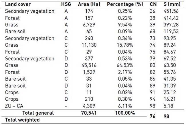 In turn, land cover and uses can be classified according to their hydrological conditions. The hydrological conditions of the vegetation cover, is considered poor when less than 50% of the area is covered vegetation, average between 50 and 75% and good conditions with values greater than 75% [34].