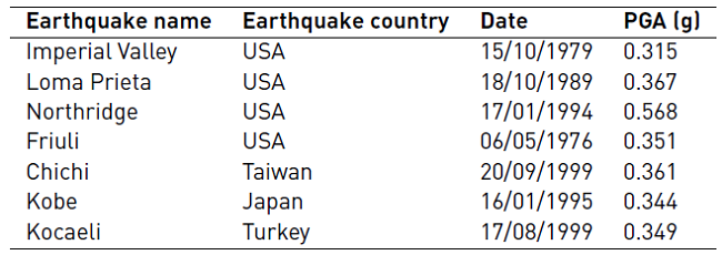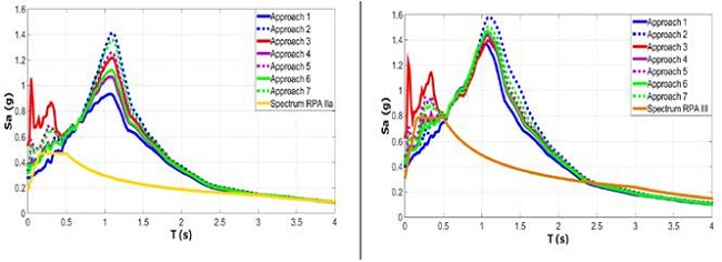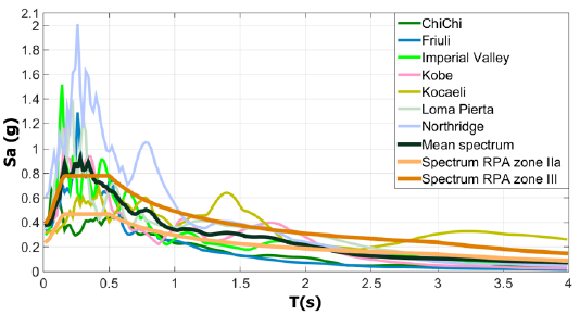 Two sets of ground motions that are representative of different intensity measures are used in the response history analysis. The first set represents a moderate seismic zone (zone IIa) and the second a high seismic zone (zone III). The ground motion set selected is scaled to represent ground motions with a RPA99/V.2003 elastics designs spectrum's zone IIa and zone III.