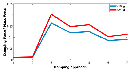 The Ratio of damping force to mass force was observed to identify the damping models which may have as potential results, unreasonably high damping forces [21].
