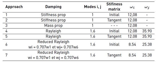 On approach 4, Rayleigh damping was used where the initial stiffness matrix was used to calculate the damping matrix C by Equation 1.