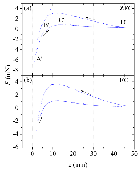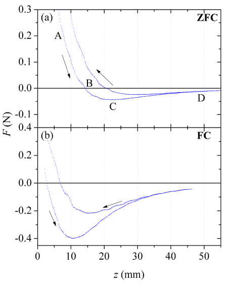 The observed hysteretic behaviours are related to hysteresis in the magnetization (M) of the sample. For type II superconductors, a magnetic flux B can penetrate from its surface when a magnetic field H is applied. This produces a magnetization M = B/µ0 - H in the material. On the other side, since the applied field decreases with the distance to the permanent magnet, its gradient is negative [Figures 6a and b); then according to Equation (1), the force has an opposite sign than the magnetization.