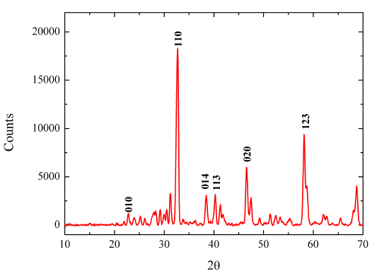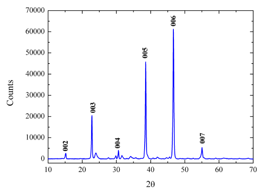 Figure 5 shows the X-ray diffraction pattern for the texturized sample (MTG), which presents the characteristic peaks and intensity relations corresponding to the YBCO-123 superconducting phase, with lattice parameters a = (3.820621 ± 0.000251) Å, b = (3.886608 ± 0.000301) Å and c = (11.685328 ± 0.000408) Å, determined by Rietveld refinement. It is noticeable a preferential growth of the sample along the c -axis, corresponding to the (001) planes [43, 44].