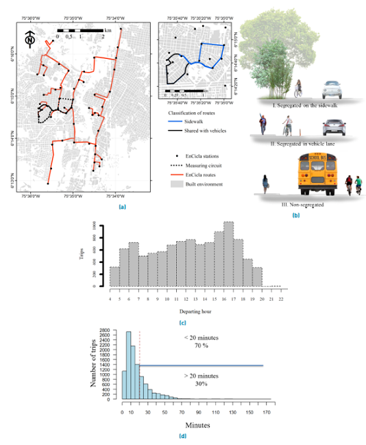 EnCicla is a BSS with 51 stations and more than 35 km of routes that are divided into three types of lanes [Figure 1a and 1b): i) segregated on the sidewalk (25.3 km), ii) segregated in a vehicle lane, separated by vertical elements (9.5 km), and iii) non-segregated, where the bicycle shares the lane with automobiles (0.2 km). According to the origin/destination information of the BSS, there are three peak periods of use, a morning interval from 06:00 to 07:00 hours, another in the middle of the day from 12:00 to 14:00 hours, and a third one in the afternoon from 16:00 to 17:00 hours [Figure 1c). We defined a 5-km circuit within the routes of the system in order to monitor the PM2.5 concentrations. The circuit is located in a relatively flat portion of the city where the mean altitudinal difference between stations is no more than 35 m in 2 km (gradient < 2%), thus reducing the influence of gradient in the efficiency of vehicles and facilitating the measuring procedure for bicyclists. The circuit also goes along heavy-traffic roads, intermediate-traffic roads and residential roads [Figure 1a).