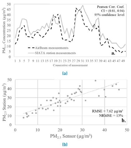 During 50 hours, we measured close to one of the SIATA stations (UNAL) in an outdoors non-controlled environment, as similar as possible to the conditions that we might find measuring on route. We used hourly average concentrations from the AirBeam sensor and hourly averaged concentrations reported by SIATA [Figure 2]. We found a Pearson correlation coefficient in the range of (0.81 - 0.94) with a 95% confidence that can be explained by the differences in the methodologies for measurement, we have to remember that stations rely on low-vol measurement equipment and filter weighting and sensors in light scattering. We found that the sensor has a root mean square error (RMSE) of 7.6 µg/m3 and a normalized RMSE (NRMSE) of 13%. This first result of validation shows that the sensor has fairly good representation of the concentrations near the station as found recently by [48] for outdoor studies.