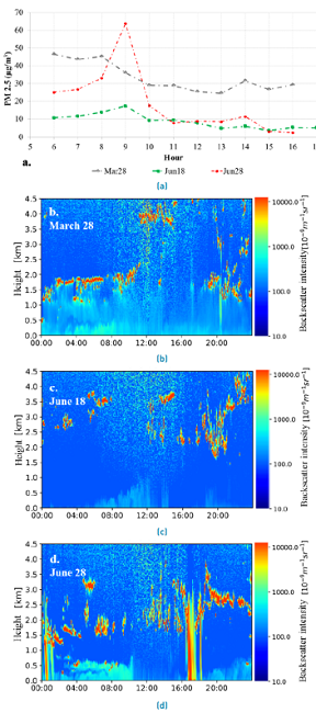 As studied by [49], the vertical profiles of backscattering in Medellin during March are characterized by the presence of clouds in the early hours of the morning that configure the valley’s atmospheric boundary layer, around 1,500 m above the surface (red color in the backscattering plots in online Figure 3b and 3d), and the presence of high backscattering (light blue in online Figure 3b) below this level due to the concentration of aerosols in the lower atmosphere. These clouds starts to disappear around midday, giving pollutants a way to ascend toward the higher levels of the atmosphere. In conditions of a clear sky or clear atmosphere, less backscattering is presented (intense blue in Figure 3b to 3d). According to previous results, we are able to verify that the sensor used provides measurements on site that are consistent with the dynamics of the atmospheric concentrations of aerosols and particles in the region [Figure 3a compared to Figure 3b to 3d).