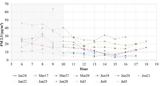 For 13 days, we completed 141 h of complete measuring circuits. The dates of the measurements were defined according to two criteria: i) days during the dry season when rain would not interfere with the measurements (February, June, and July); ii) days during the dry-wet transition when the atmospheric stability increases the concentrations of pollutants in the region (March). The average PM2.5 values in the hours measured during the days of monitoring are presented in Table 1. Mean values for reported days with more than 10 continuous hours of measurement in the dry season ranged between 9.6 and 18.9 μg/m3, while in March, during the season transition, concentrations ranged between 20 and 33 μg/m3. The daily cycle of concentrations shows that between 06:00 and 10:00 hours, concentrations are consistently higher than those in later hours (shaded region in Figure 4].