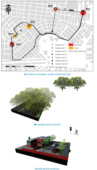 Onsite inspection of hotspots permitted us to define two types, according to the built environment: i) canopy tunnel and ii) road intersection. The main characteristic of a canopy tunnel is the closure of high tree canopy over the cycling route. The road intersection type of hotspot corresponds to those places where cyclists needed to wait for more than 2 min in order to cross heavy-transportation roads. The factors identified that influence the concentration of pollutants at those intersections are that: i) the average speed of vehicles is reduced in order to stop for red lights and to start up after green lights; ii) the number of vehicles waiting for a green light increases the number of sources near the cyclist; iii) busy roads include heavy traffic such as buses and trucks.