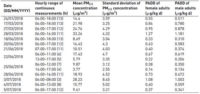 Daily cycles of concentrations reveal that in the early morning it is possible for mean values to reach up to 63 μg/m3 [Figure 4 and Table 2]. Those values may be considered as harmful for sensitive groups or even harmful for everybody according to the air quality index (AQI) calculation defined in the regional normativity [50]. The average time for each monitoring circuit is 40 min, resulting in an average speed of 6.7 m/s that we will consider as moderate to strong effort (IR for males 3.0 m3/d and for females 2.7 m3/d). PADD ranges between 0.13 and 1.18 μg/kg/d for males and from 0.14 to 1.27 μg/kg/d for females, showing that it is highly dependent on the season as it is doubled from January to March, and also can be increased by 30% if PM2.5 is averaged for morning hours or afternoon hours (see June monitoring dates in Table 1].