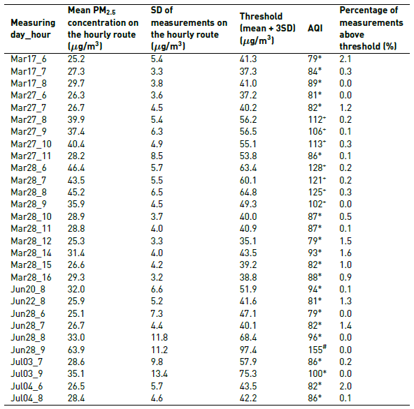 We selected the hourly routes with a mean concentration of PM2.5 equal to or higher than 25 μg/m3. This is considered as a control value because it is the condition of mean concentrations in the city reported by the WHO, and therefore we assume that higher values are due to unusual conditions. After detecting those routes with a mean value above the control and use the Shapiro-Wilk test [47] to identify if the hourly data is normally distributed, we defined a threshold for the identification of hotspots as locations measured on the route reaching concentrations higher than three standard deviations above the mean value (both calculated with the measuring records of the selected route). This threshold represents persistent concentrations above the environmental conditions that may be occurring due to the configuration of the route (e.g. traffic lights, interaction with vehicles or obstacles to the dispersion of pollutants). After detecting hotspots, we compare the concentration and daily cycle of the concentrations measured on the hotspots and the route for a detailed analysis.