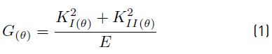 Where KI(θ) and KII(θ) are the stress intensity factors in mode I and mode II, respectively, as defined by Equations (2) and (3), and E is the Young's modulus.