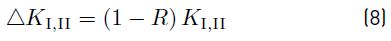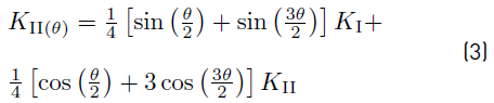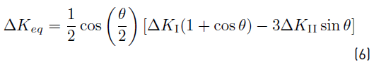 The model proposed in 29 for the case of cyclic loading to predict fatigue crack growth in mixed mode, was extended in 26. Based on MTS criteria, the authors proposed Equation (6) to determine the equivalent stress intensity factor range.