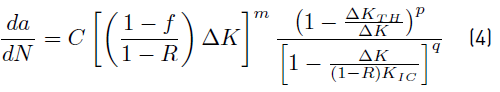 In terms of fatigue crack growth, four high strength steels with martensitic structure were studied and the results were compared with those obtained in other investigations with similar steels 16. The authors corroborated that the values of the Paris Law parameters are similar for this type of steels. Furthermore, the influence of specimen size parameters on fatigue crack growth rate was evaluated for an AISI 4340 steel, concluding that specimen thickness and width have no significant influence 17. An empirical law based on the concepts of Linear Elastic Fracture Mechanics (LEFM), which is very useful for predicting the fatigue crack growth in stage II, was proposed 18. However, there are approaches to predict the fatigue crack growth rate (da/dN) in the three growing stages, being the NASGRO equation (Equation (4)), one of the most commonly used 19-22. This equation incorporates the effect of fatigue crack closing through the f parameter, defined in 23, which depends on the amplitude of the crack opening due to plasticity effects. It also takes into consideration the effect of the fatigue stress intensity ratio (R), under constant amplitude loads, C, m, p and q are empiric material constants, ΔKTH is the threshold stress intensity factor range for fatigue crack growth, KIC is fracture toughness and ΔK is the stress intensity factor range. The factor [(1 - f) / (1 - R)]m is also known as velocity factor and takes a value of less than 1 when there is a crack closure mechanism 24; otherwise, it takes the value of 1.