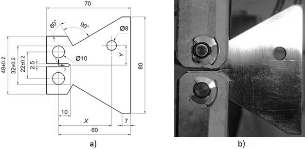 The samples for fatigue testing were prepared with a geometry based on the TDCB specimen, modified with a drilled hole, i.e. deflecting hole, in order to induce mixed-mode loading conditions (see Figure 1a). Five 12 mm thick samples with different deflecting hole location were manufactured using the XY global coordinate system as a frame of reference. Pre-cracking and fatigue testing were conducted with a Zwick Roell Vibrophore Amsler 150 HFP 5100 machine. Figure 1b shows an actual picture of one of the samples with the pre-crack.