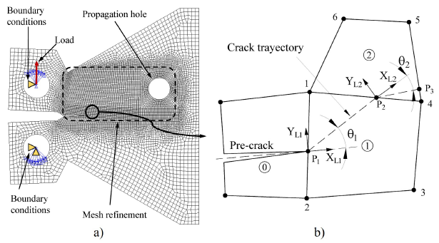 The fatigue crack growth simulation was carried out in ANSYS Mechanical APDL. For this purpose, an XFEM model was implemented using algorithms (APDL macros) developed by the authors 38. A first order quadrilateral mesh was generated with a significant refinement in the zone where crack propagation is predicted to occur (see Figure 3a). A mesh sensibility analysis was performed in 38 and it was confirmed that a global element size of 1.0 mm and a refined zone element size of 0.1 mm are appropriate to register accurate path results. Then, a pre-crack with the same characteristics as those obtained experimentally (length and placement) for each sample, was introduced. To define the boundary conditions, additional nodes were created at the fixing holes centers, which were rigidly joined to the portion of each hole that is in contact with the pin. The central node of the lower hole was fixed, while the central node of the upper hole was restricted only in the horizontal direction. The load was applied in vertical direction in the upper hole central node. The model was solved in an iterative process, element by element until reaching the deflecting hole. The values of KI and KII were determined and the MERR criterion was used to calculate the crack growth direction through each finite element. Figure 3b shows a representation of the crack propagation (discontinuous line) across the mesh elements. The crack passes through points P1, P2 and P3. The crack growth direction (θ) is determined in the local coordinate system, which is localized in the crack tip and is aligned with the crack in the last cracked element.