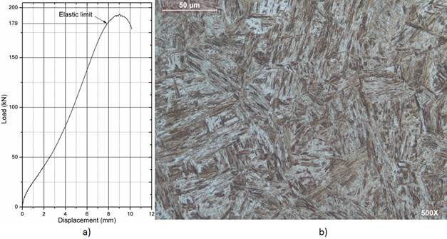 Figures 4a and 4b presents a representative stress-strain curve obtained for a tensile test sample and a picture of the microstructure of the tested steel, correspondingly. The average tensile strength and yield strength were determined to be 1598 MPa and 1480 MPa, respectively. The average Young's modulus was 206 GPa. The microstructure was fully composed of tempered martensite. The average hardness value obtained was 52 HRC. The fracture toughness was calculated to be 3194 . The measured mechanical properties and the observed microstructure are in agreement with a DIN 1.8721 low alloy steel in the quenched and tempered state.