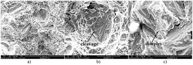 Figures 5a to 5c show images of the fracture surface of toughness test samples with different magnifications, obtained with a Quanta 650-FEI Scanning Electron Microscope (SEM). A mixed fracture pattern with dimples and cleavage is observed in the fracture surface. This mixed fracture pattern is typical in high strength steels. The presence of circular dimples indicates the loading mode I predominance, according to ASTM E-399 35.