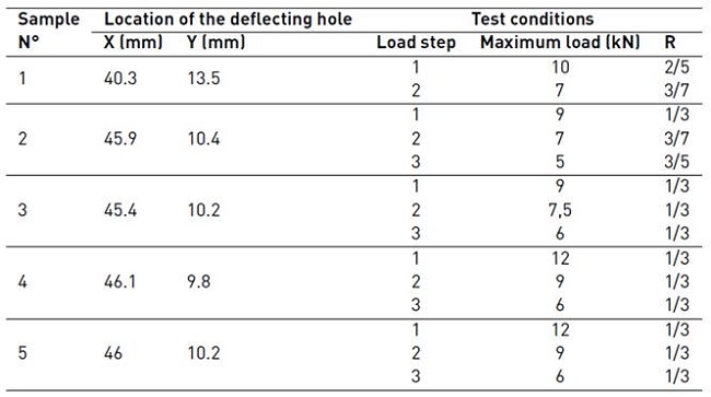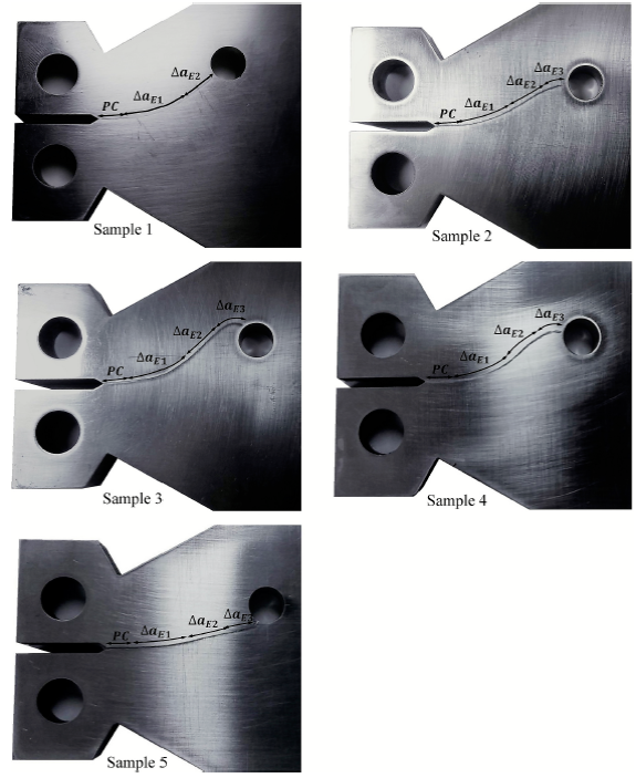 The samples parameters for fatigue testing are described in Table 1. The maximum applied load varies between 5 kN and 12 kN, the load ratio R varies between 1/3 and 3/5, each sample is subjected to 2 or 3 load steps. The increase in size crack (ΔaE ), the corresponding number of cycles (ΔNE ), and the crack propagation path, were recorded for each load step.