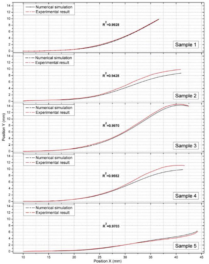 Figure 7 presents an overlap of the fatigue crack paths obtained experimentally (continuous red line) and those obtained by numerical simulation (dashed black line). These paths have been plotted in the global coordinate system indicated in Figure 1a. Each path includes the pre-crack (approximately 8 mm length) and the propagation path to the deflecting hole. It can be appreciated that there is a good correlation between numerical and experimental results. The best fit was obtained for samples 1 and 3, with R2 correlation coefficients of 0.9928 and 0.9970 respectively. The smaller correlation coefficient was obtained for samples 2 and 4, with correlation coefficients of 0.9428 and 0.9552 respectively. The difference may be caused by microstructural defects of the material, such as inclusions, grain boundaries and sliding planes, which could randomly deflect the crack propagation path 44,45.