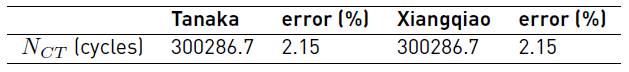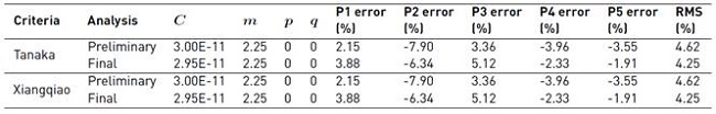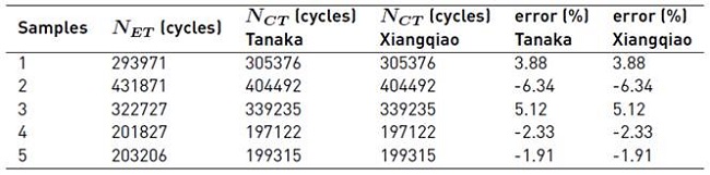 For each sample, the total number of cycles (NCT ) is calculated as indicated in the step 4 of mathematical model calibration procedure (section 4). Table 8 shows this value for the optimal combination of the preliminary analysis in sample 1, as well as the absolute error according to Tanaka and Xiangqiao criteria. For this sample, the absolute error is small (2.15%), but is greater for the other samples.