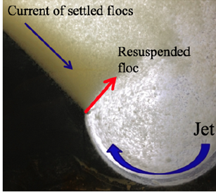 The creation of super dense flocs inside flocculator was observed in this experiment, however these flocs appear to have different dimensions inside HRS tank. These particles probably were broken at the inlet manifold of the tank, and this could be a possible reason for the high values of turbidity in the experiment, compared with the outlet turbidity in real tanks.