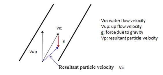The technology of plate settlers relies on the theory that particles need to settle down in a surface, which in a traditional sedimentation is the bottom of the tank; but any surface with a horizontal component can be used to increase the capture area of the tank. [5]. It is important to note that the efficiency of a single particle settling depends on the total horizontal area available for settling. Plate settlers can increase the horizontal area by a factor of 10 or more [5]. These plates capture particles that escape from the floc blanket and slide down back to the floc blanket, as shown in Figure 2. Tarpagkou et. al. documented the comparison between the efficiency for a traditional sedimentation tank and sedimentation using lamellar settlers at the top of the tank. They found that the particle concentration is lower at the bottom of the tank with no settlers; on the other hand, due to the use of inclined plate settlers, particles slide down again to the bottom of the tanks, making the flow denser. The efficiency in a traditional tank and a tank with plate settlers were 14% and 75%, respectively [12]. Al-kizwini et al., demonstrated that the best inclination for the settles is at 30º angle, thus the basin used increased sediment removal efficiency [5].
