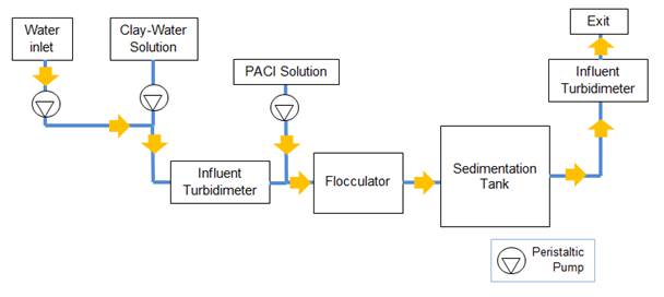 Water with a turbidity of 100 NTU was treated in the experiment. To obtain this turbidity, a relation of 60 g of clay per liter of water was used during the experiment and the turbidity was controlled by the inlet turbidimeter.