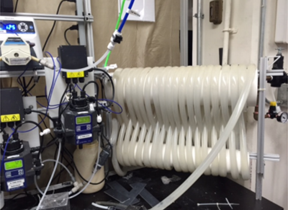 The flocculator was constructed using 7/8 in. (2.2 cm) nominal diameter tubing and a total length of 27.6 m. The tubing was wrapped around two 6 in. (15.2 cm) pipes (nominal diameter) in a figure eight for better mixing and to achieve an energy dissipation of 8.7 mW/kg. To avoid settling of particles, the orientation of the flocculator was as shown in Figure 5.