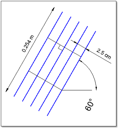 The arrangement of plate settlers had a set of parallel plates of 0.254 m length made with polyvinyl chloride (PVC) sheets of 1/16 inches (1.59 mm) thickness. The plates spacing was 2.5 cm and the plates were oriented 60 degrees from the horizontal as shown in Figure 6. This configuration increased the projected horizontal settling area by a factor of 5 and thus gave a capture velocity of 0.4 mm/s when the upflow velocity was 2 mm/s.