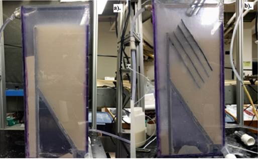 Figure 7 depicts floc blankets formed inside the tank for two case experiments. Figure 7.a) shows the floc blanket formed without plate settlers inside the tank and Figure 7.b) shows the floc blanket with plates at the top. One can see that an interface of clear water and the floc blanket was formed below the level of the sludge weir when plate settlers are installed, while the interface in the tank without plate settlers is formed at the same level of the sludge weir. Floc blanket in Figure 7.b) also seems to be denser and, it is possible to observe the effect of plate settlers on the redistribution of flocs inside the tank.