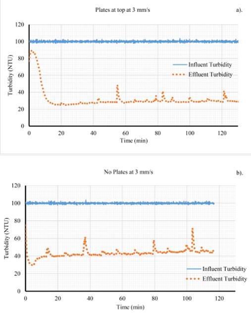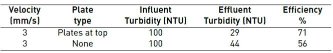 As can be seen in Table 1, the average effluent turbidity values for the first case is 29 NTU, while the effluent turbidity without plate settlers is 44 NTU, in same conditions of influent turbidity and velocity. This result could be attributed to the capture of particles by the plates; as a result, the particles slide down to the floc blanket and possibly increase the particle-particle interaction.