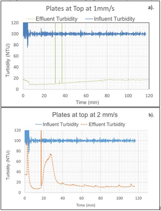 Furthermore, a quantitative comparison between the case in which plate settlers are used and when they are not used is presented in Figure 8. It is clear that effluent turbidity in the first case present lower values than when plate settlers are not installed.