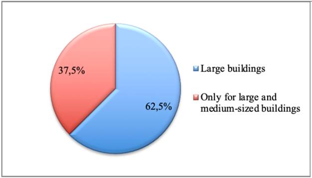As noted in the chart, all experts believed it to be feasible to use monitoring systems in large buildings, 37.5% also targeted application in medium-sized structures. None, however, envisioned implementing monitoring systems in small buildings.