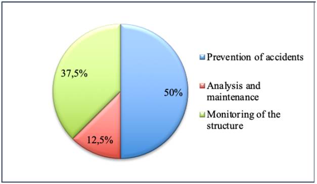As listed above, the structural monitoring should be planned and justified, and may be motivated by several factors. The possible options in the survey included existing conditions (defects), structure care, accident prevention, educational means (scholastic foundation, calculation program creation, etc.), and proof of numerical methods in addition to the option of listing another motivation. It was expected that the factors relating to structural care and accident prevention would be the most popular, and this was confirmed by the survey responses [Figure 3 ).
