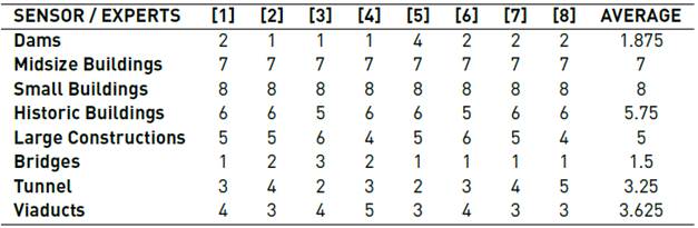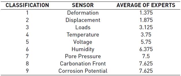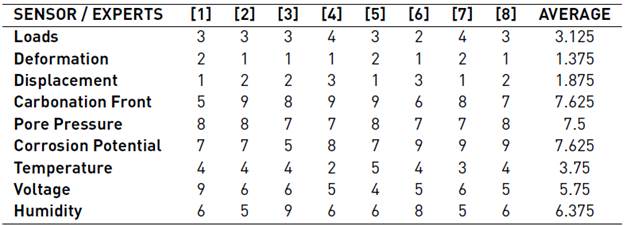The following types of sensors comprise the possible alternatives: deformation, temperature, displacement, voltage, loads, humidity, pore pressure, carbonation front, and corrosion potential sensors. It was predicted that deformation and displacement sensors are the most used as they are available to all commercial companies and have a higher reported use. The eight experts ranked their choices from most used to least used, and with this information, averages were obtained [Table 1].