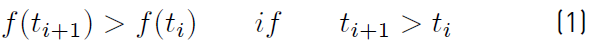 The proposed peak detection method is based on the similarities between the PPG waveform and a mountain range. If every PPG pulse is considered as a single mountain, then the systolic peak can be thought as the top of the mountain. Likewise, if one begins to climb the rising edge that precedes the systolic peak, it can be assumed that the latter will be reached when the slope changes from positive to negative. This equals to assume that the rising edge preceding the systolic peak is a strictly increasing function, which can be denoted as f. Thus, every point composing the systolic rising edge satisfies the condition (1):