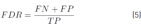 where TP, FN and FP denote, respectively, the number true positives (systolic peaks labeled as systolic peaks), the number of false negatives (un-detected systolic peaks) and the number of false positives (false or error peaks labeled as systolic peaks). Both a FN and a FP counted as a detection error, so for this study the failed detection rate (FDR) was defined by Equation (5):