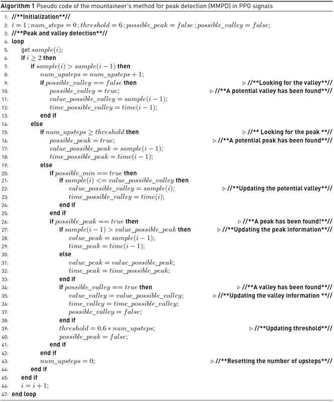 The crest time (i.e., the time interval measured from the onset of the systolic rising edge to the systolic peak) was found to be around 0.1 s for healthy subjects [9], depending on the heart rate (HR). Hence, for a sampling rate of 100 Hz, the systolic rising edge will be composed of ten samples and the condition (1) will be satisfied nine times before the systolic peak is reached. A pseudo code for the proposed method (MMPD) is shown in Algorithm 1.