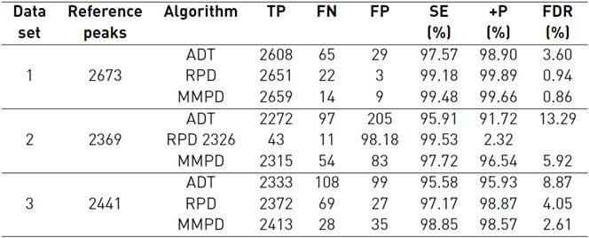 Tables 1 and 2 summarize how accurate the three algorithms (ADT, RPD and MMPD) were in detecting, respectively, peaks and valleys from authentic PPG signals.