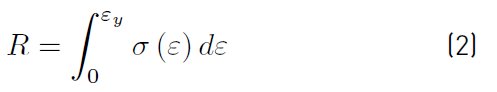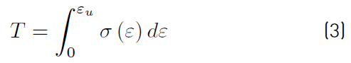 To perform the calculation of the toughness of the tested and simulated specimens, the criterion that the toughness is the area under the stress versus the strain curve to the point where the rupture stress occurs was assumed. Similarly, it was assumed that resilience is the area under the stress versus the strain curve, but only in the domain of elastic strain. [24]Therefore, it is possible to calculate both the resilience (R) and toughness (T) solving the definite integral of the stress versus strain curve (Equations (2) and (3)].