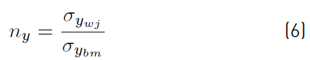 Table 7 shows the values of different parameters determined in tensile tests at welded joints. Efficiency is defined as the ratio of the property of the welded joint and the base material, thereby the efficiencies at yield and the efficiencies at rupture are determined from Equations (6) and (7) respectively. Subscripts bm and wj make reference to the base material and the welded joint, in that order.
