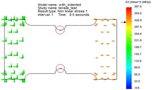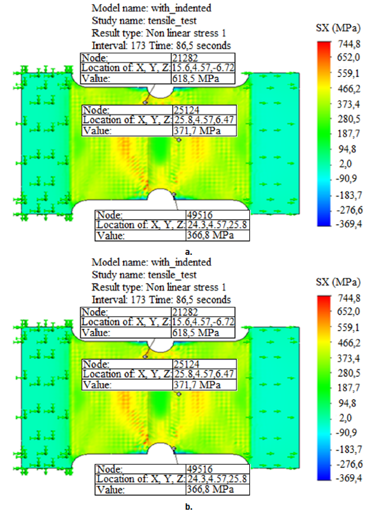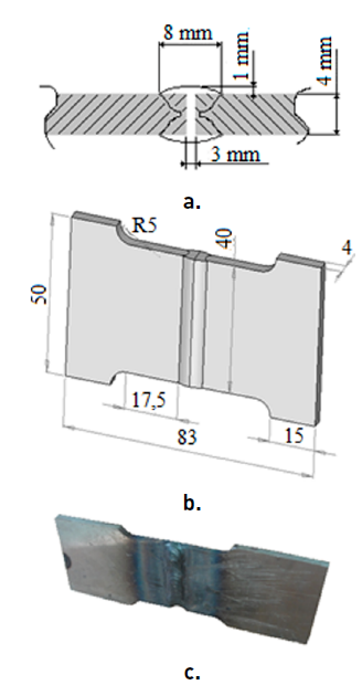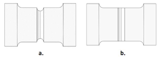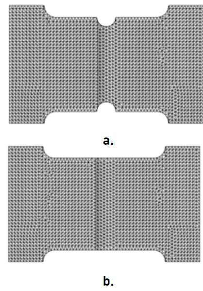 Geometric models used to perform numerical simulations of tensile test are shown in the Figure 2. The geometric modelling was performed in the SolidWorks software, and to develop numerical simulations complement Simulation was used. The notch shown in Figure 2a was developed to induce the fail in the filler material.