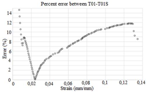 In Figure 10, the percentage error between the samples T01 and T01S is exposed. As shown, the value of the percentage error between the actual specimen and the numerical simulation is never greater than 15%, which can be considered allowable.