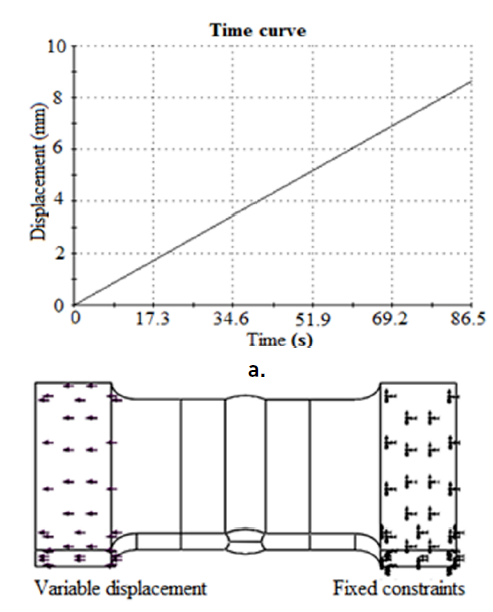 According to the points above, it was decided to simulate this test specimen applying the constraints and loads shown in Figure 3b. At the right end fixed restrictions were applied, considering that the fixed head of the testing machine is on that side. To simulate the tailstock of the machine, it was decided to apply at the left end of the specimen a variable displacement in time from zero to its final value [Figure 3a). For simulated specimens, the final value of displacement is shown in Table 5 (at each simulated specimen, it was added a letter S for the nomenclature).